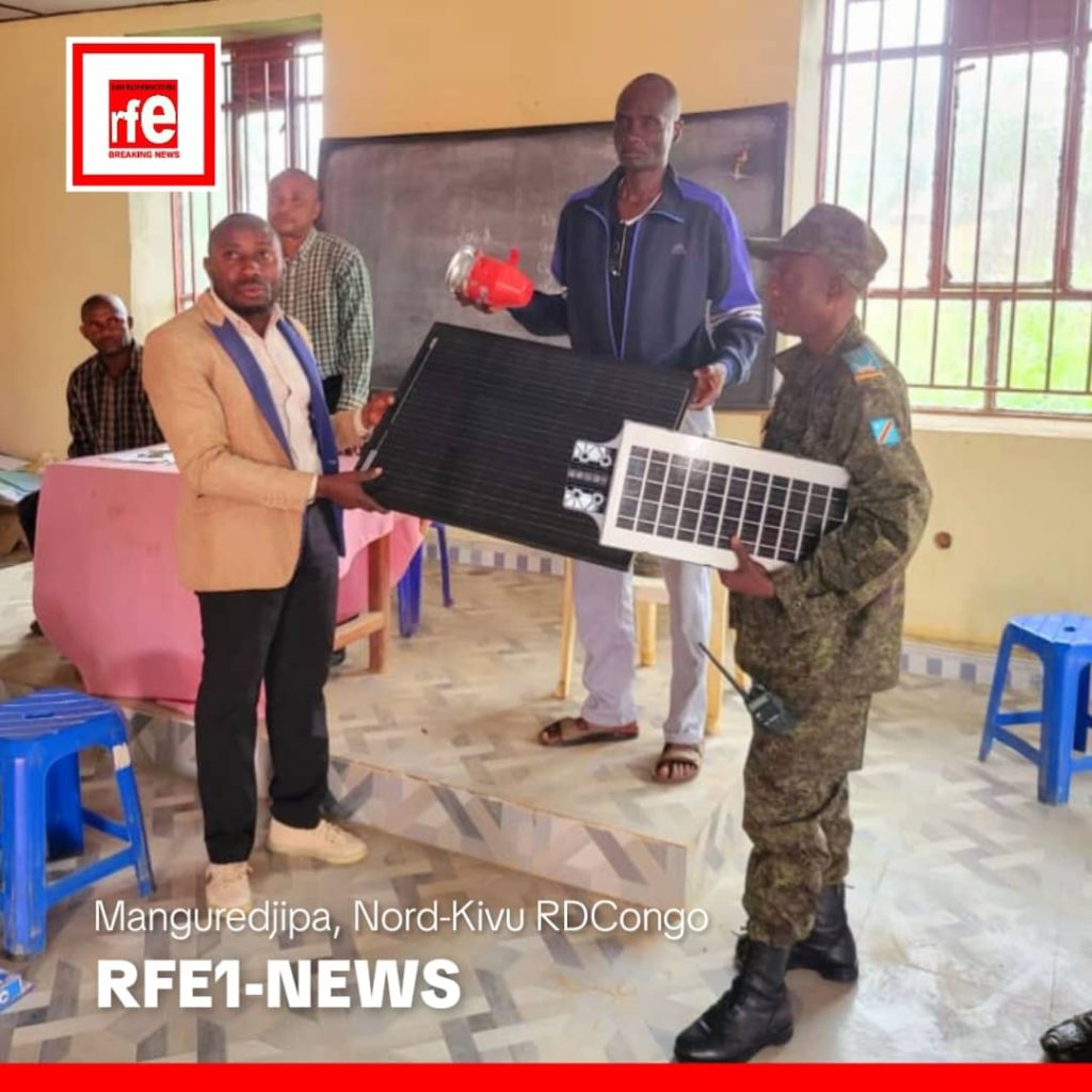 Ce samedi 14 Mars 2026 à Manguredjipa, le point focal de l’Organisation non gouvernementale UBUNTU PANAFRIKA asbl SAMUEL KAKULE KAGHENI a remis un lot important des matériels d’éclairage public en présence du représentant du chef de secteur des Bapere, monsieur ORTHIN N’SELE BAHATI présent à cet événement. N’SELE BAHATI a vivement remercié l’initiative d’Ubuntu Panafrika inscrit dans le cadre de renforcement du mariage civilo-militaire dans l’axe routier Butembo – Manguredjipa qui est minée par l’activisme des présumés combattants terroristes des Forces Démocratiques Alliées ( ADF